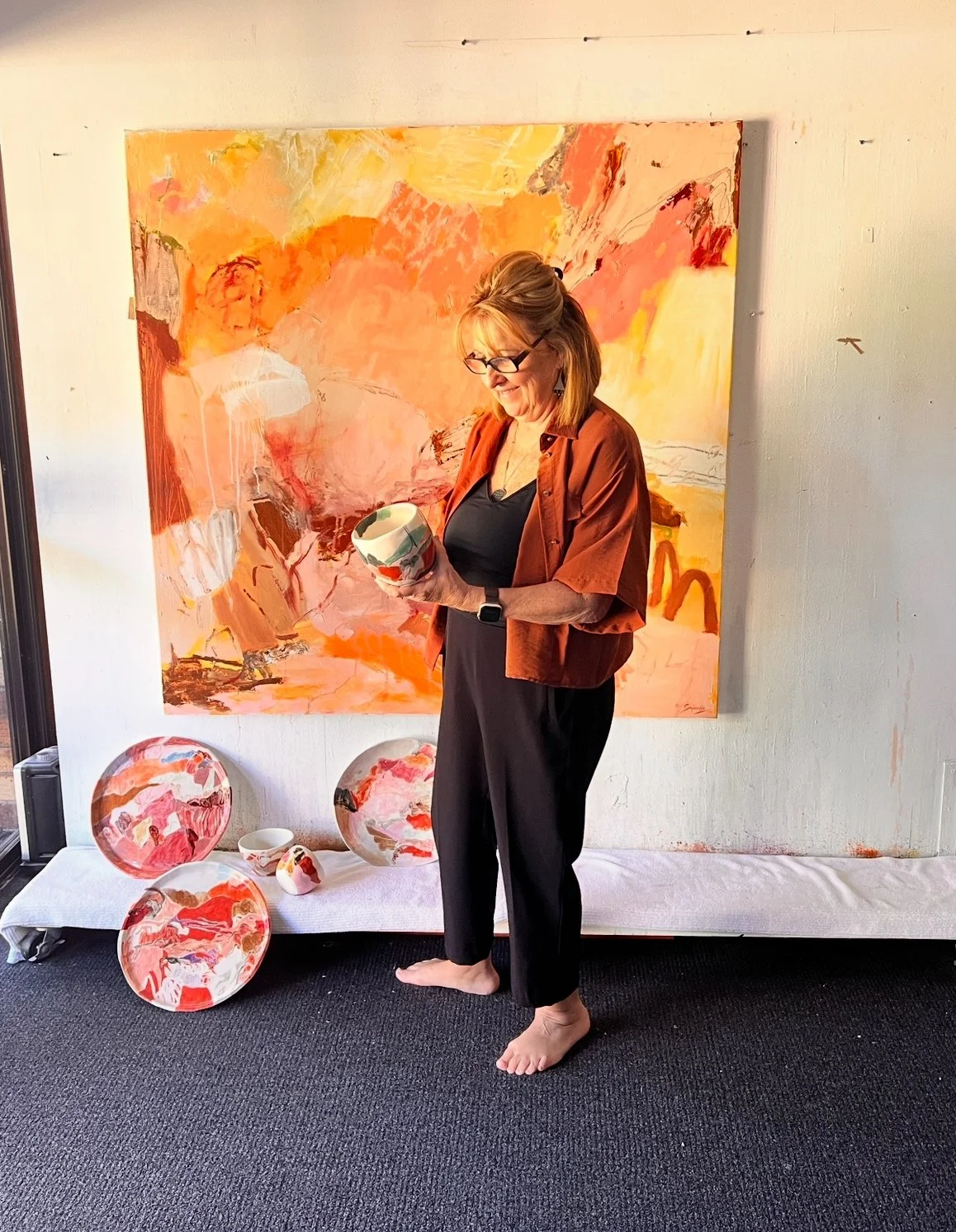 The paintings in this exhibition, along with her hand painted ceramics, capture, in abstract, the wide, open spaces and the panorama of unfolding ranges. In contrast to this depiction of magnificence and sense of immensity, is a representation of a more secluded immersion in, and entanglement with, nature. Camping, contemplating, sketching the reeds and mottled gums hugging a river or being embraced by warm rocky outcrops in the bush, listening to bush talk; its birdsong, the leaves rustled by gentle breezes or smelling the creek mist as it rises at dusk and being wrapped by an ethereal damp, prompts Sue to consider that, as Aristotle noted, there is, indeed, in “all things of nature, something of the marvellous.”