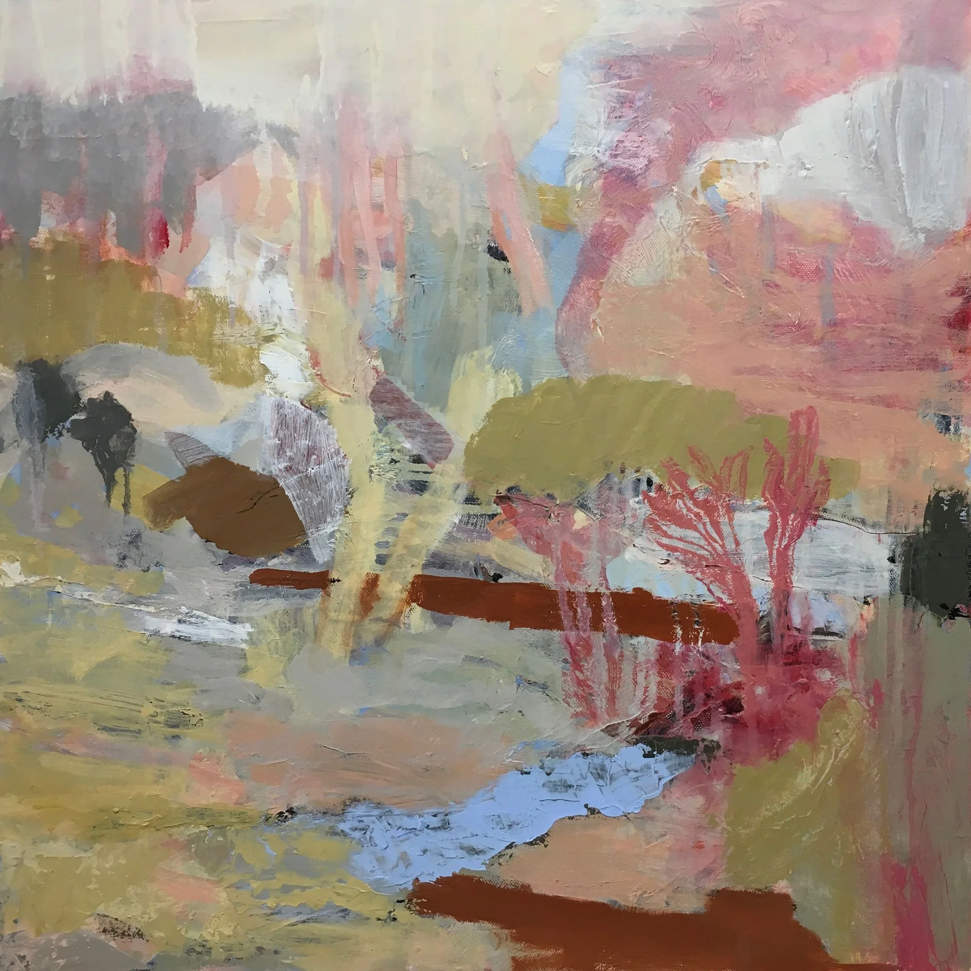 In contrast, vertical wooden fence posts that mark the paddock boundaries are cut horizontally by razor-sharp wire and cooling creeks snake through the countryside. Nature offers up a myriad of shapes and the mark- making in the paintings of this collection-- by palette knife, brush, scraping or the use of deliberate drips of paint-- collectively work to evoke the variances and depth of calligraphic-like shapes offered up by the Australian landscape. The way in which shapes tell a story is a focus of these paintings but this collection is also influenced by the nuances of natural light and colour.